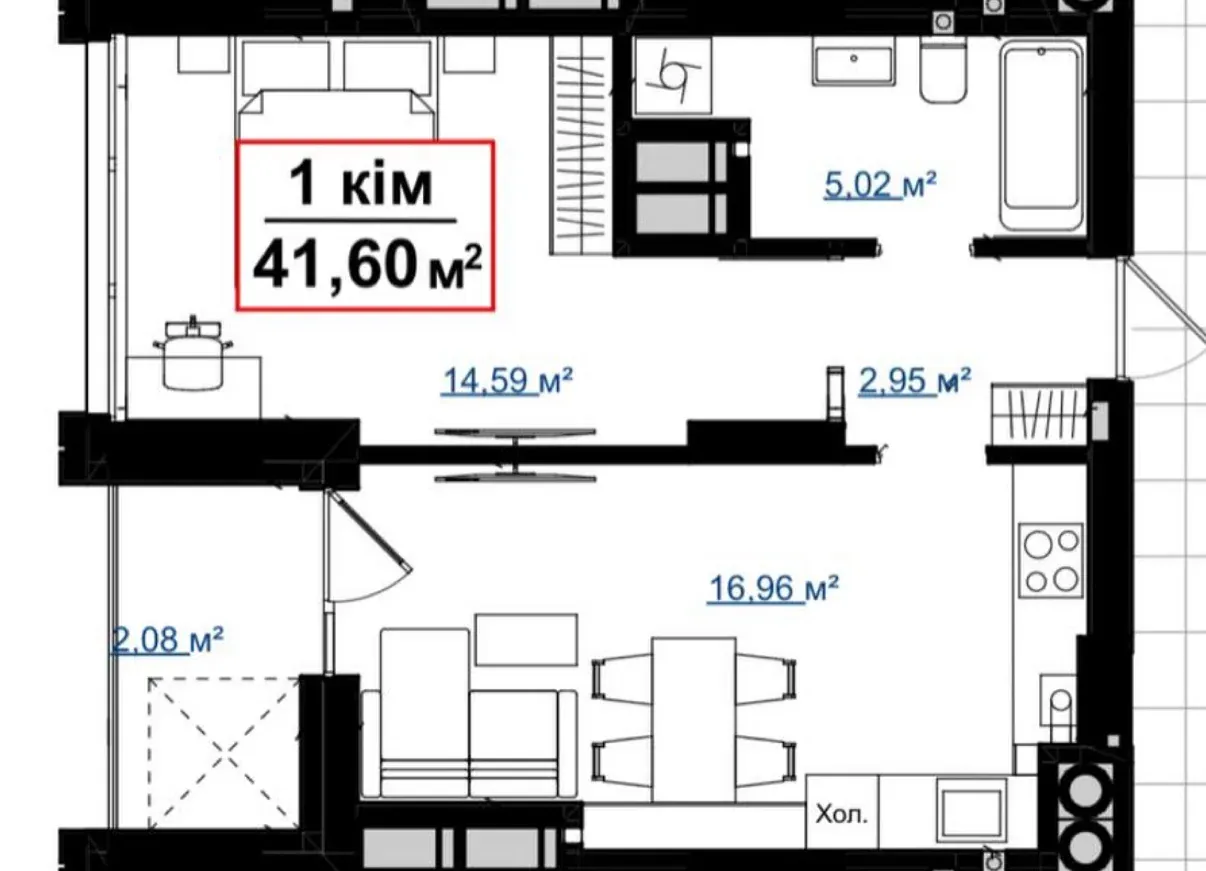 Видова однокімнатна квартира на етапі будівництва