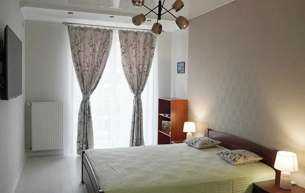 Є балкон, автономне газове опалення, підігрів підлоги, якісні меблі (спальня з натурального дерева) та техніка: телевізор 55", холодильник, пральна машина, духовка, мікрохвильова піч, пилосос, праска, фільтри для води і тп. Велика кухня (можна поставити диван та зробити 1.5 кімнатну).